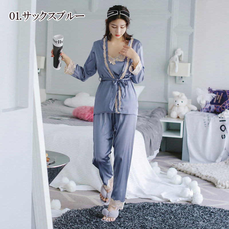 ルームウェア レディース パジャマ ナイトウェア ナイトガウン キャミソール ショーパン 長袖 長ズボン 3点セット 上下セット ガウンセット 前開き セクシー おしゃれ 可愛い 大人 シンプル 寝間着 部屋着 着心地 さらさら サテン 女性用 送料無料 春夏 秋冬 オールシーズン 20代 30代 40代 50代◆4点セット◆ ◆5点セット◆